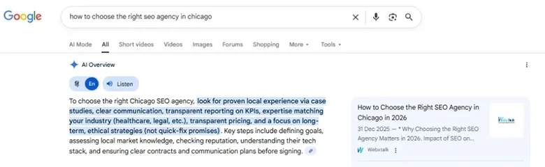 For example, if a user asks about “How to Choose the Right SEO Agency in Chicago in 2026”, AI Mode does not just show links; it extracts insights from authoritative sources and provides a formatted response. Follow-up questions can be asked without losing context, simplifying and speeding up the search process.